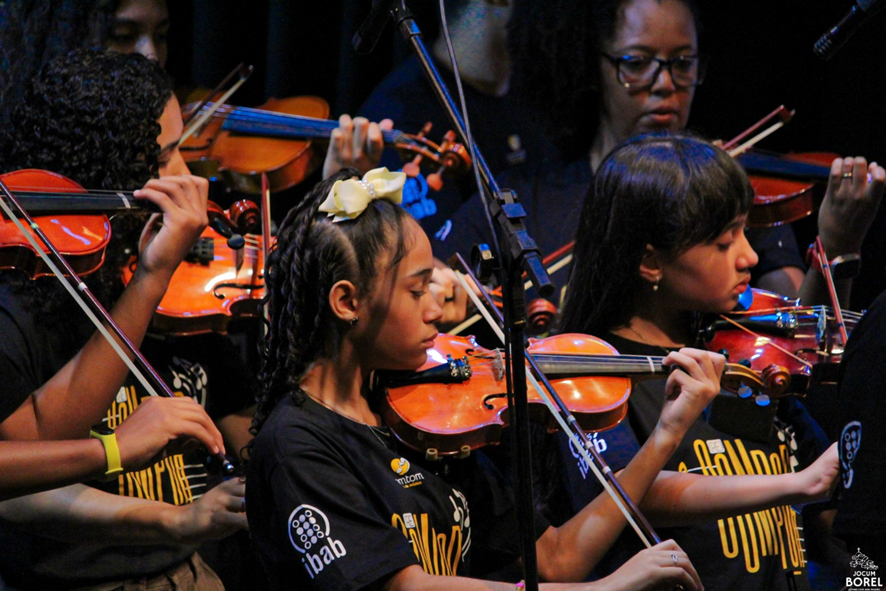 Programa de iniciação musical, com aulas teóricas e práticas de violão, contrabaixo, bateria, violino, teclado, flauta doce, percussão e técnica vocal.